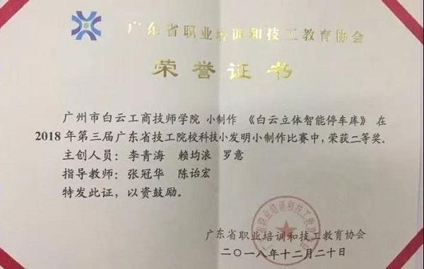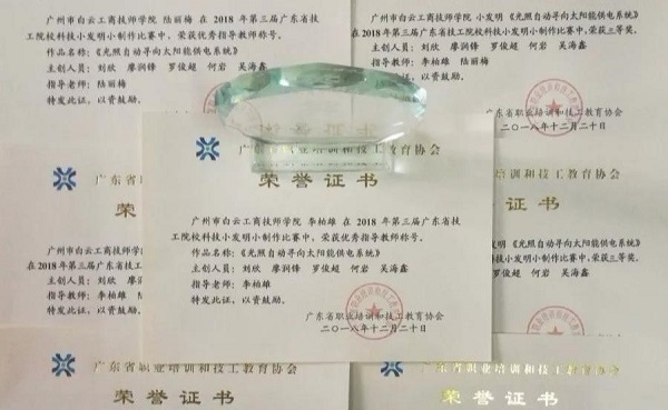 理想職業(yè)從白云開始12月20日,第三屆廣東省技工院??萍夹“l(fā)明小制作比賽決賽精彩上演,我校參賽的6個優(yōu)秀作品統(tǒng)統(tǒng)獲獎。其中,機電系派出的兩個參賽隊伍經(jīng)過激烈的角逐,張冠華、陳詒宏老師指導(dǎo)的“立體智能停車庫”小制作項目榮獲二等獎;李柏雄、陸麗梅老師指導(dǎo)的“光照自動尋向太陽能供電系統(tǒng)”小發(fā)明項目榮獲三等獎;四位老師也榮獲“優(yōu)秀指導(dǎo)老師”獎。